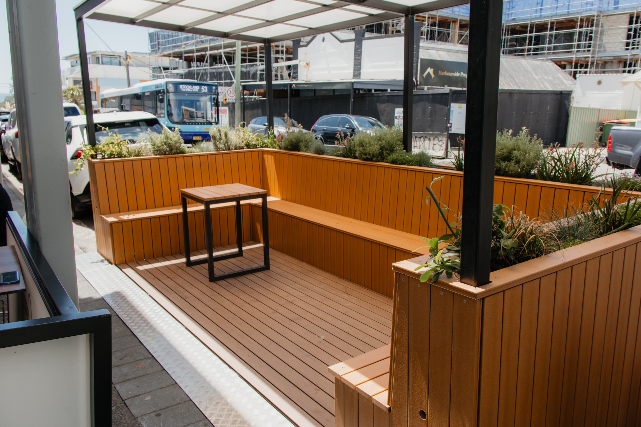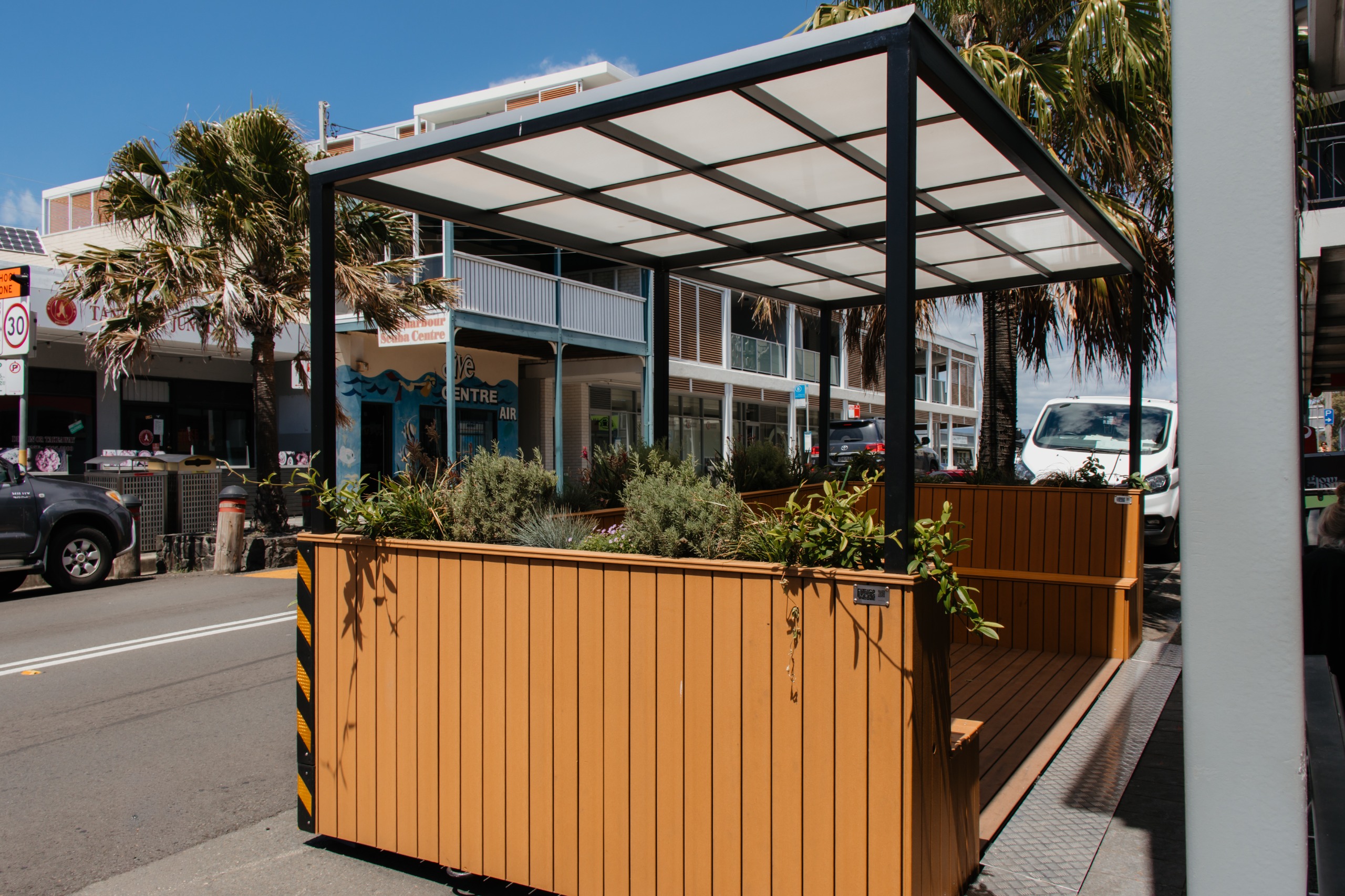 This parklet trial brings the NSW Government Movement and Place Framework to life in Shellharbour Village, creating a space that balances street movement with a people-friendly, vibrant public area.